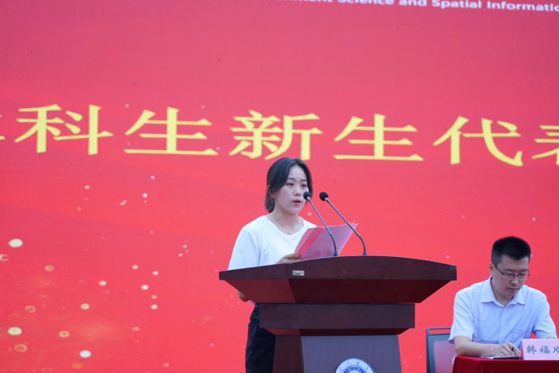 院学生会主席朱守庆同学作为本科生代表发言。他分享了自己精彩纷呈的大学生活,希望和每一位志同道合的环测人一起怀揣希望与理想,无悔前行。随后,资源与环境专业2021级硕士研究生王梦涵和测绘类2021-4班王楠迪分别代表研究生新生和本科生新生进行了发言,她们希望与各位同学共勉,保持初心、积极生活、服务社会,并祝愿各位同学在矿大继续书写自己精彩的人生篇章。
