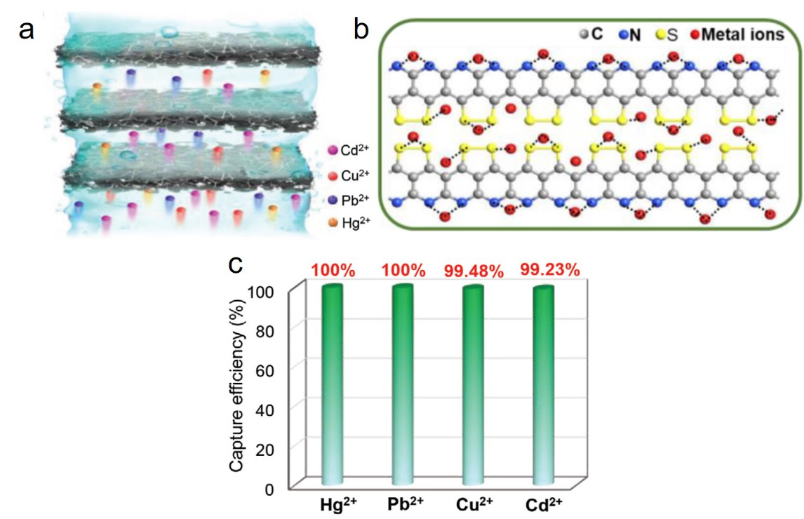 过滤原理:硫化PAN的C—N,C=N,C—S—S—C基团表现出软碱性质。据软硬酸规则(HSAB),这些软碱基团与Hg2+、Pb2+、Cu2+、Cd2+软酸离子作用力强,能通过静电吸引束缚重金属离子,完成水体净化(图2a、2b)。