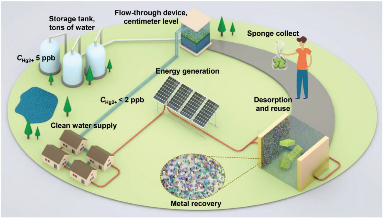 经济与环保效应:如下图所示,本工作报道的滤材可以通过太阳能等清洁能源转换而来的电能完成回收利用,不断为居民区提供重金属含量极低的安全饮用水。整个装置的造价与电能成本总计仅30.75美元。Hg2+、Pb2+、Cu2+、Cd2+处理成本分别为0.17、0.47、0.94、0.94美元/吨。处理成本与现行技术相当甚至更低,并且整个过程更为环保。