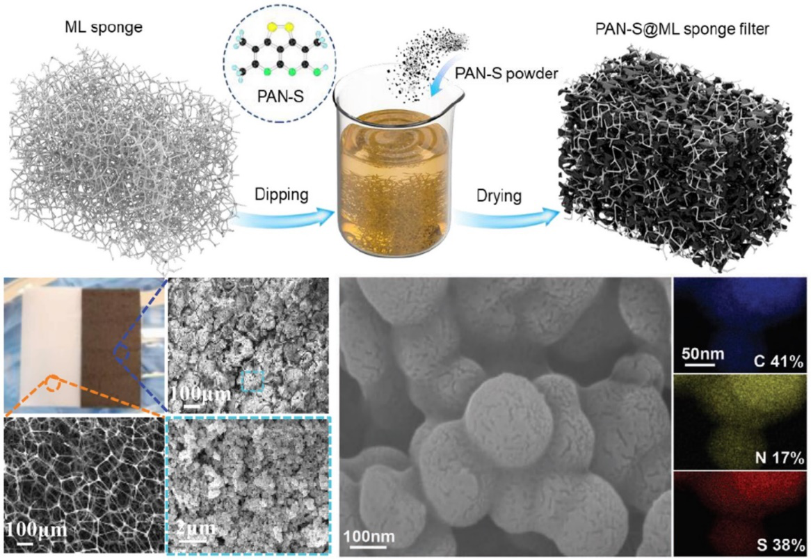 合成方法:利用便捷的涂布法(dip-coating),将硫化PAN颗粒整合至三聚氰胺海绵中。电镜图片显示,硫化PAN颗粒填充在三聚氰胺网格的孔隙中。