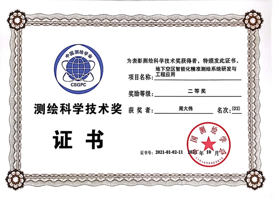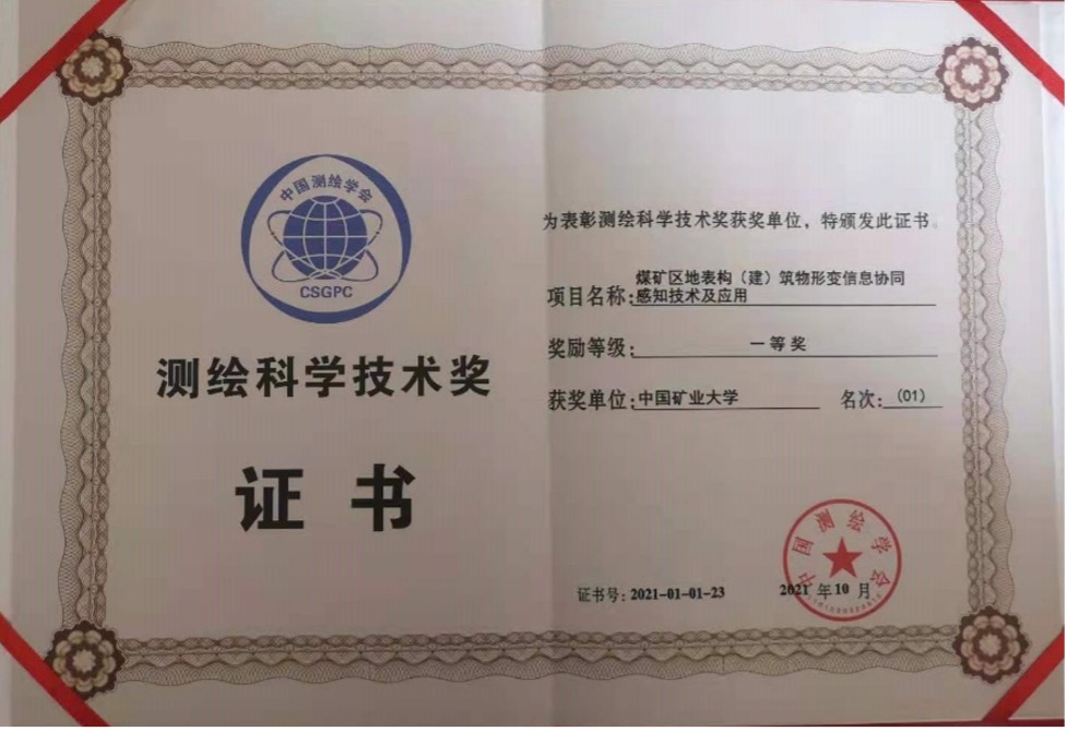 周大伟副教授参与的《地下空区智能化精准测绘系统研发与工程应用》项目荣获测绘科学技术二等奖;高井祥教授主持的项目面向矿区构建筑物形变监测应用,攻克高精度观测信息融合定位关键技术难题,构建多源协同感知定位技术体系,研发矿区典型构建筑物监测软硬系统,具有广阔的应用前景和现实意义。