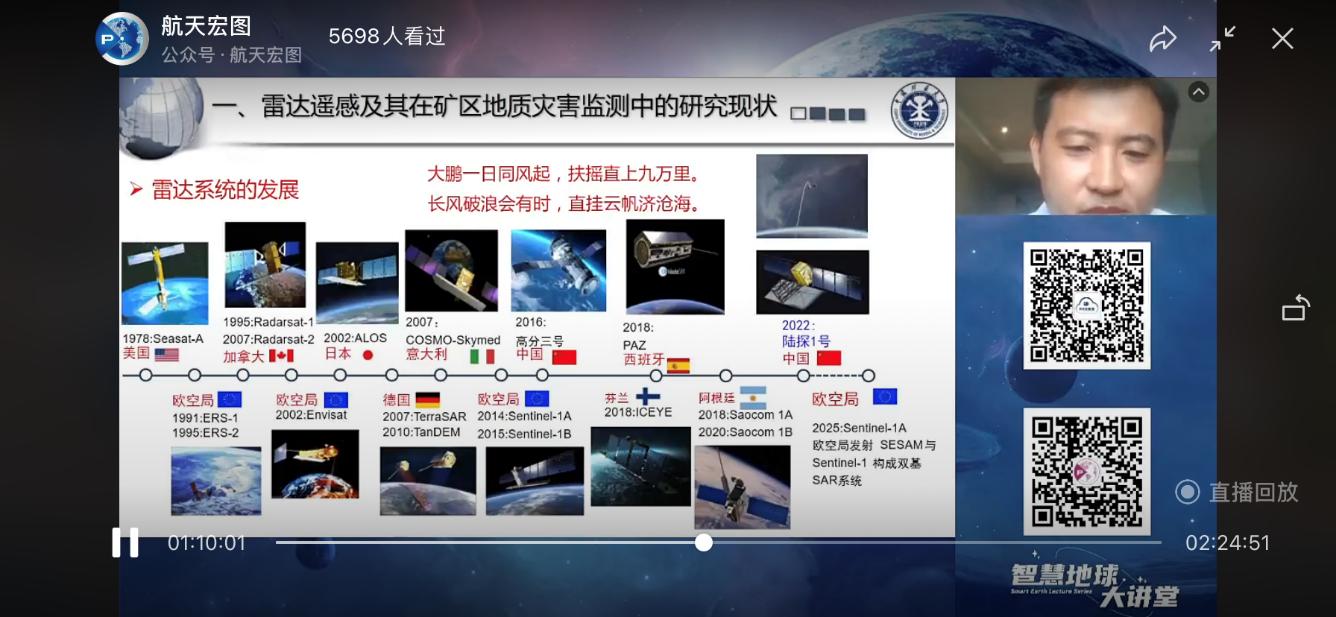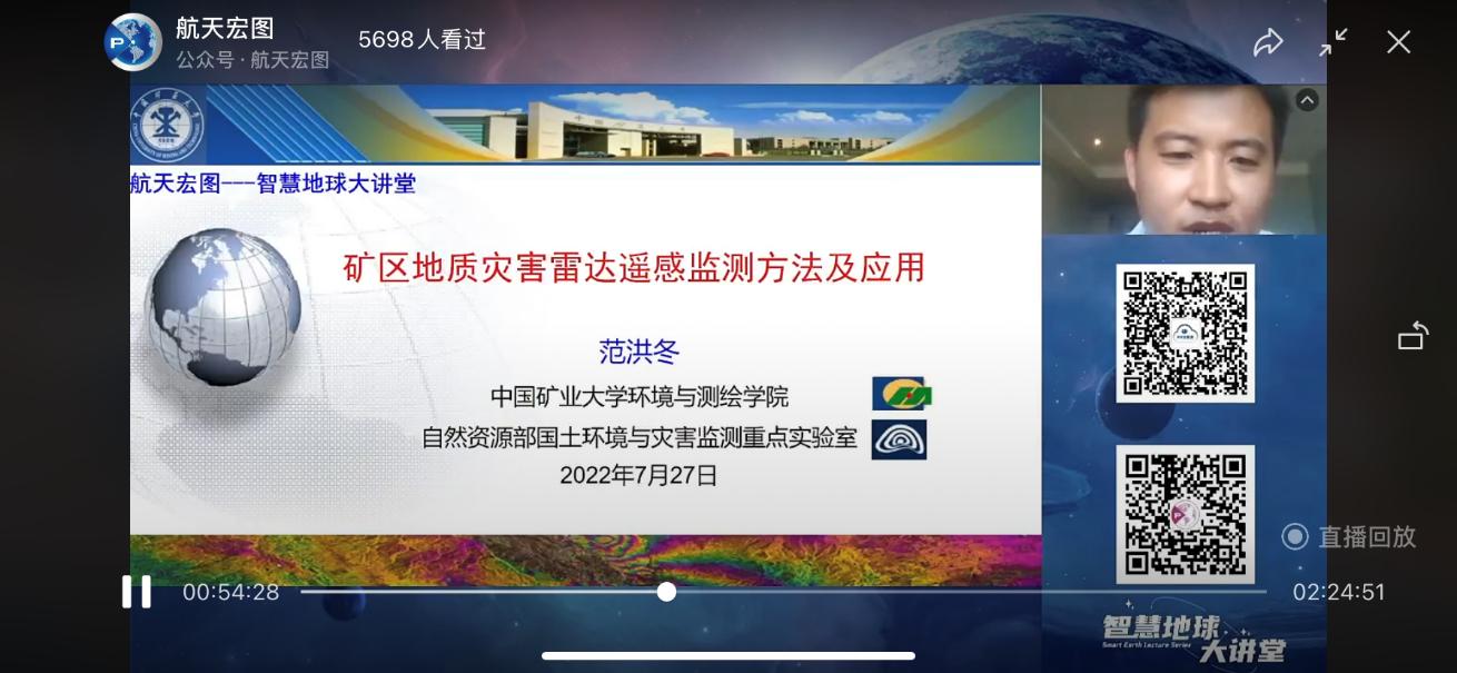 范洪冬老师做客“智慧地球大讲堂”,在线作了题为“矿区地质灾害雷达遥感监测方法及应用”的学术报告。本次报告共吸引了近5700人次观看,受到国内相关领域专家、学者的关注。