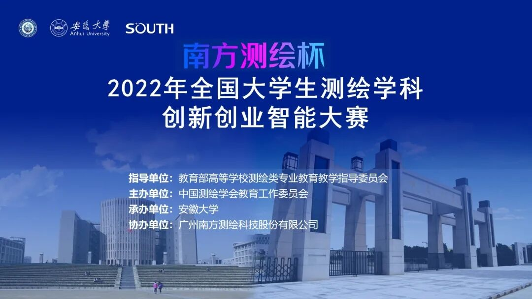 2022年7月19日-21日,“南方测绘杯”2022年全国大学生测绘学科创新创业智能大赛在安徽大学成功举办。大赛由中国测绘学会教育工作委员会(以下简称“测教委”)主办,安徽大学承办,广州南方测绘科技股份有限公司协办。大赛的举办旨在更好地发挥测绘学科特色与优势,积极响应“大众创业、万众创新”的号召,培养测绘类专业大学生创新创业意识和实践应用能力,为社会输送创新型、复合型测绘地理信息人才。