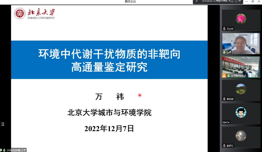 国家杰出青年科学基金获得者北京大学万祎特聘研究员作了题为环境中代谢干扰物质的非靶向高通量鉴定研究的报告。报告从污染物的非靶向高通量鉴定、内源代谢分子网络的可视化和代谢干扰物鉴定、外源污染物和内源分子的代谢反应产物和毒性鉴定三个方面介绍了污染物与代谢分子的相互作用及毒性机制。