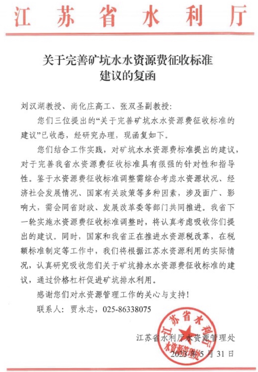 刘汉湖教授、江苏省水文水资源勘测局徐州分局尚化庄高工、徐州工程学院张双圣副教授三位专家共同向江苏省水利厅提交了“关于完善矿坑水水资源费征收标准的建议”。2023年5月31日,江苏省水利厅给予回复“关于完善矿坑水水资源费征收标准的建议的复函”,三位专家根据科研成果和实践经验,提出的建议对于完善江苏省水资源费征收标准具有很强的针对性和指导性,江苏省下一轮实施水资源费征收标准调整时,将认真考虑吸收提出的建议。