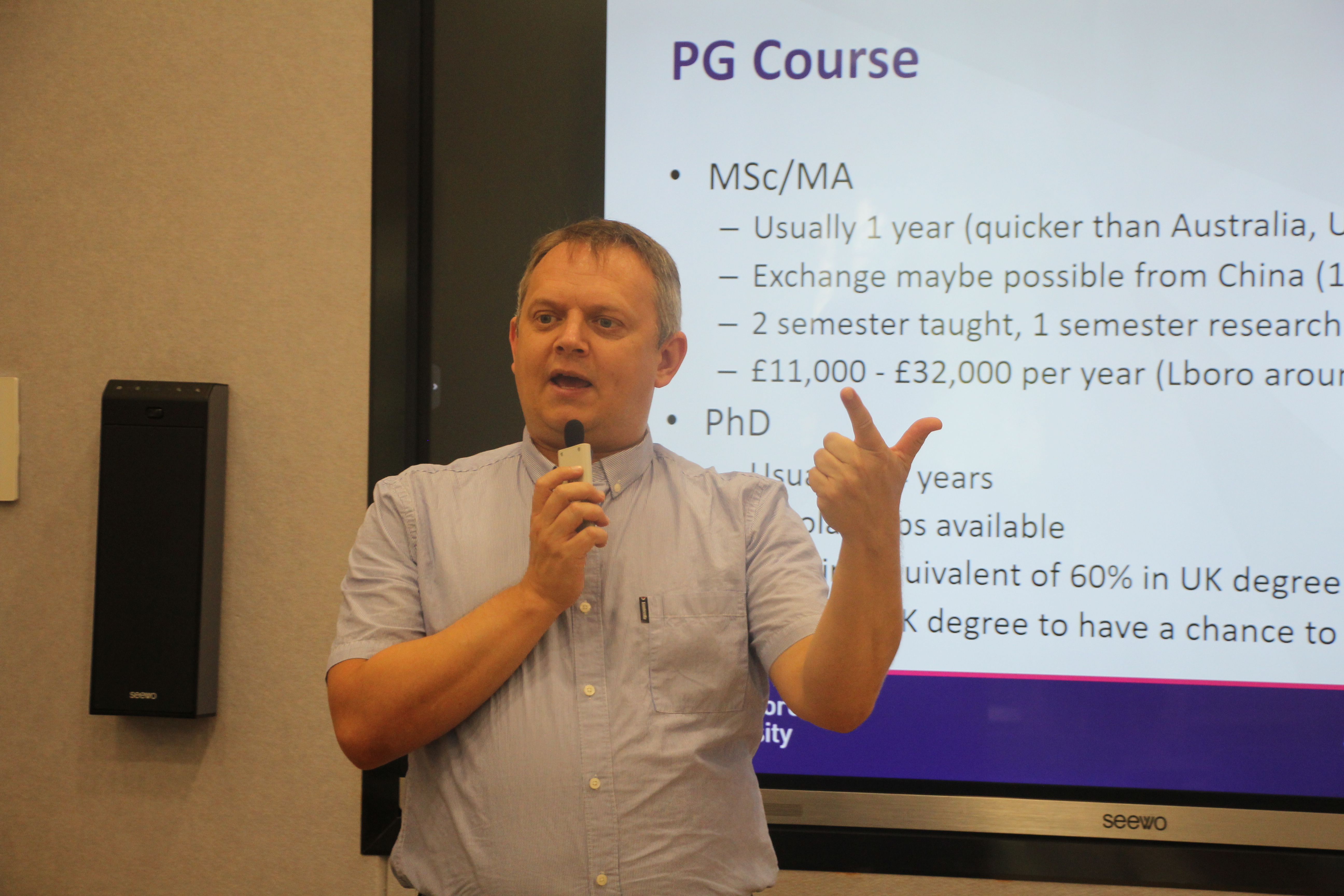 赵东升副教授开场致辞,赵老师重点强调了本次活动的目的和意义,向同学们介绍了Craig M. Hancock副教授的成就。Hancock副教授从个人留学经历、英国留学优势以及拉夫堡大学的教学环境和硕博学位申请等方面和同学们进行了交流。Hancock副教授分别从地理位置、学位申请条件、硬件设施、专业研究水平、排名等方面为同学们在择校上提供了合理建议,同时也以英国拉夫堡大学为例,利用PPT幻灯片的形式展示了拉夫堡大学完善的校园基础设施、浓厚的学术氛围,Hancock副教授也详细介绍了拉夫堡大学的硕士、博士培养计划以及学习模式,展现出拉夫堡大学严谨的学术态度与开放的学习氛围,为同学们提供一个不错的选择。Hancock副教授也对同学们申请拉夫堡大学的博士与硕士学位表示欢迎,并对申请条件以及相应奖学金情况进行了简单讲解,以供同学们参考。活动最后,同学们针对自己的个人情况向Hancock副教授进行提问,不少同学在出国留学费用以及英国大学测绘专业的课程开设情况与Hancock教授进行了交流,Hancock副教授与赵东升老师均进行了解答。