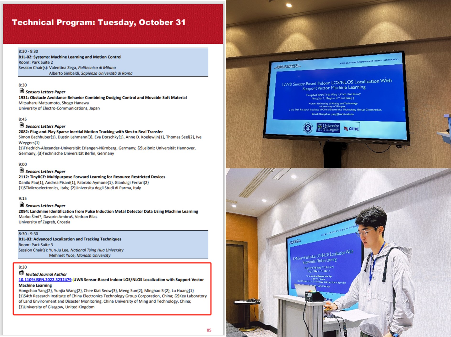 博士生杨宏超、司明豪撰写,汪云甲教授、孙猛副教授指导的论文“UWB Sensor-Based Indoor LOS/NLOS Localization With Support Vector Machine Learning”受邀入选B1L分会“Advanced Localization and Tracking Techniques”以“Invited Journal Author”进行口头汇报。基于国家重点研发计划项目《室内混合智能定位技术》的技术积累,论文提出了顾及时序和能量层面的超宽带新信道特征和误差校正算法,显著提升UWB测距及定位精度。