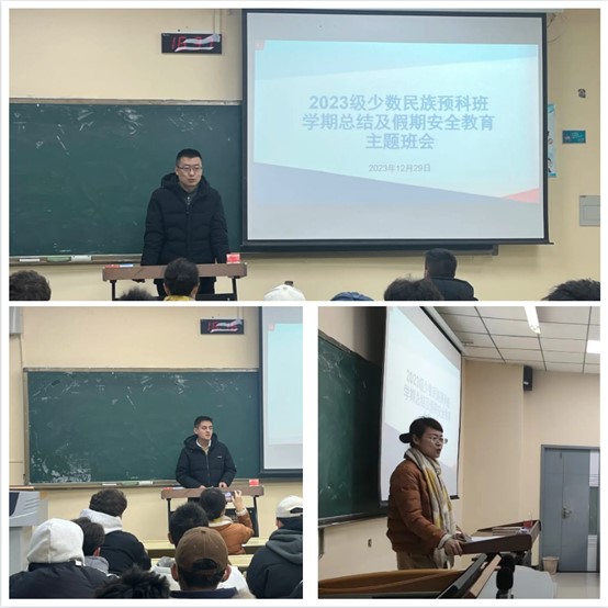 2023年12月28日,2023级少数民族预科班开展2023-2024学年第一学期总结暨寒假安全教育主题班会。学院党委副书记、预科班班主任韩福顺,预科班辅导员艾科拜尔,我校内派教师彭飞及预科班全体同学参加班会,班会由预科班班长阿丽米热·吐尔逊同学主持。