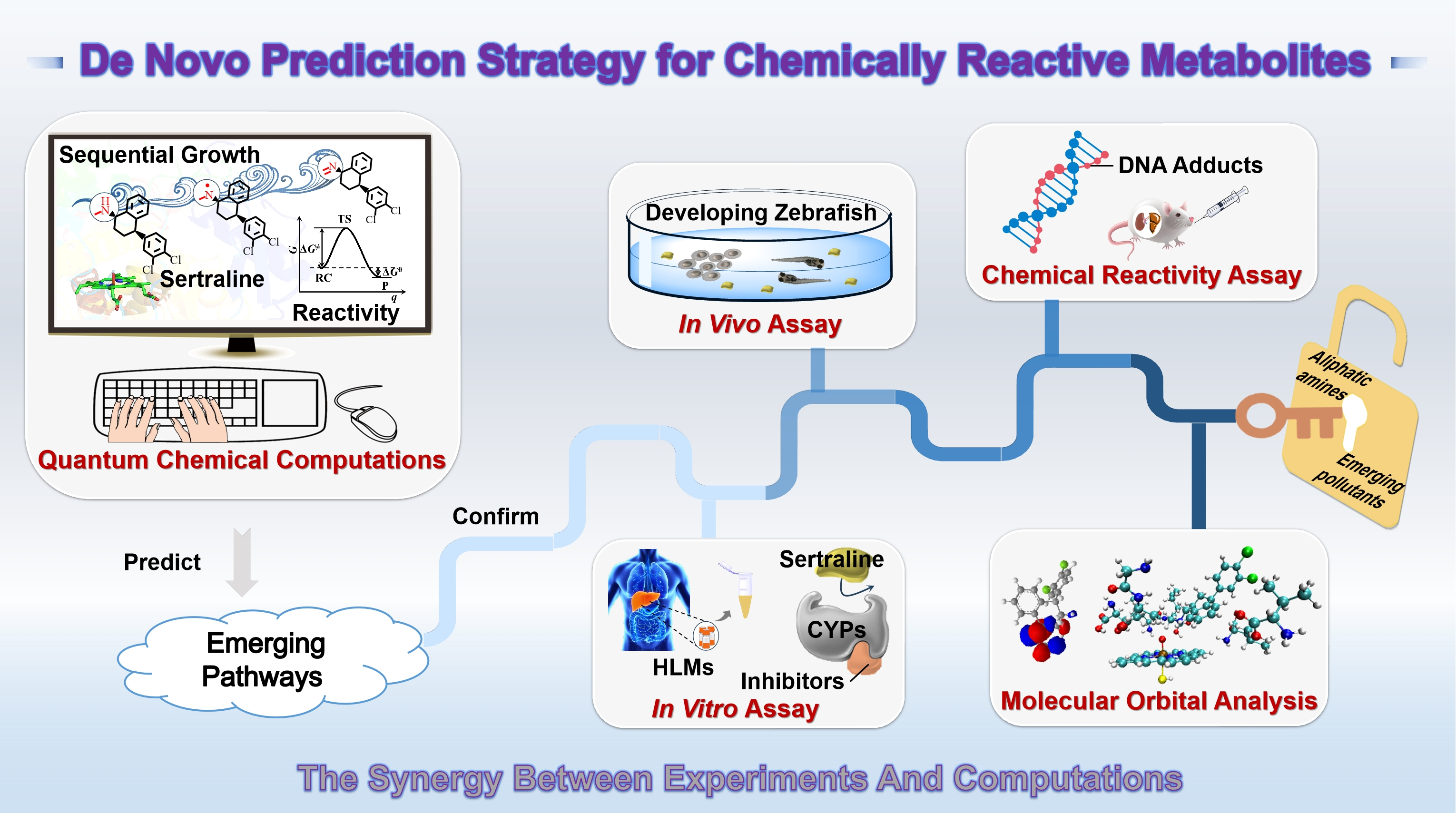 青年教师程诗洋博士等采用计算和实验多步骤协同的从头预测策略,对舍曲林的氨基官能团进行反应性顺序演进的量子化学计算预测,通过高分辨质谱方法在人肝微粒体孵育和斑马鱼胚胎暴露实验中确认了可疑致突变代谢产物舍曲林恶嗪啶的存在,并在小鼠体内试验中检测得到舍曲林恶嗪啶与DNA的加合产物。并基于Bell-Evans-Polanyi原理,揭示了脱饱和路径广泛存在于以舍曲林为模式底物的脂肪胺类微污染物中,如农药阿特拉津和轮胎抗氧化剂6PPD等。该工作发展的从头预测方法有望为科学评估新污染物在全生命周期过程中的环境健康风险提供支撑。相关研究成果形成题为“Insight into chemically reactive metabolites of aliphatic amine pollutants: A de novo prediction strategy and case study of sertraline”的学术论文近期在线发表于环境健康领域顶级学术期刊《Environmental Internatinal》(中国科学院一区Top期刊,IF=11.8)。
