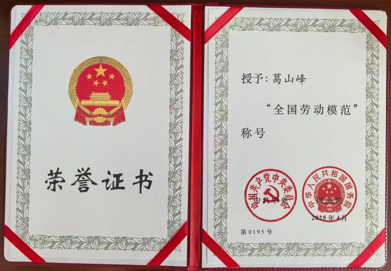 4月28日,全国劳动模范和先进工作者表彰大会在北京人民大会堂隆重举行,葛山峰赴京参加大会,并被授予“全国劳动模范”荣誉称号。