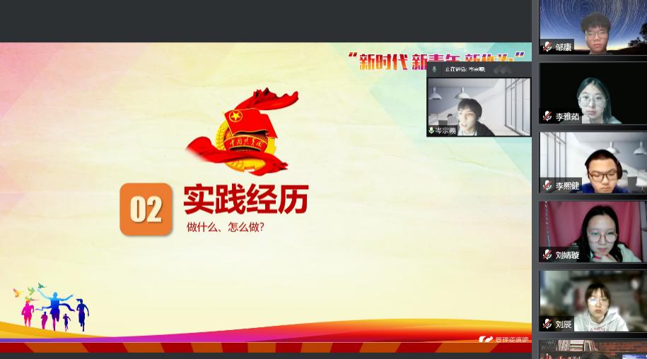本科测绘党支部预备党员蒋凯歌同志从自身学习和学生工作经历出发,表示我们青年要争当堪当民族复兴重任的时代新人;本科环境党支部党员霍冠男同志作了题为“以青春之名,书时代华章”的学习汇报,认为青年要主动参与到劳动实践中,在基层一线去增长实际本领;本科地信党支部预备党员饶然杰同志结合校党委刘波书记抗疫思政大课内容,从“肩负复兴重任,争做时代新人”、“坚定青春信仰,听好学好思政课”、“牢记初心使命,传承红色基因”等三方面作了学习分享。